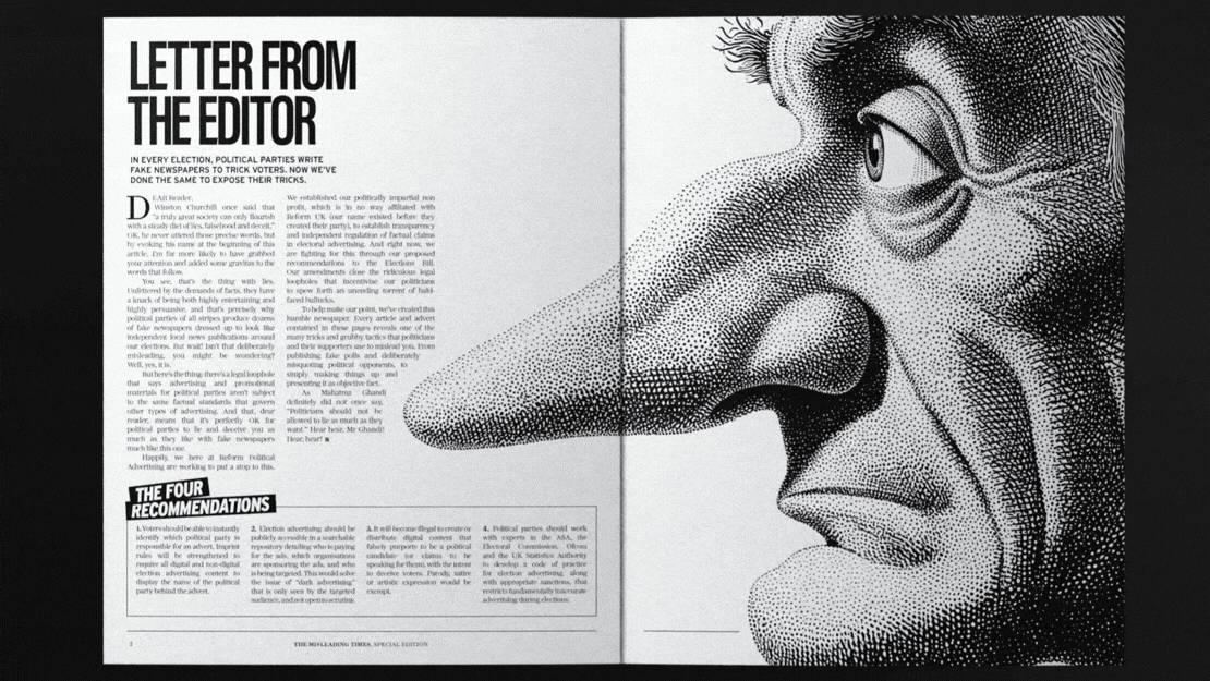 Reform Political Advertising want to change the law. So to coincide with Labour’s Elections Bill, we made The Misleading Times, a fake newspaper sent it to every MP in the country.