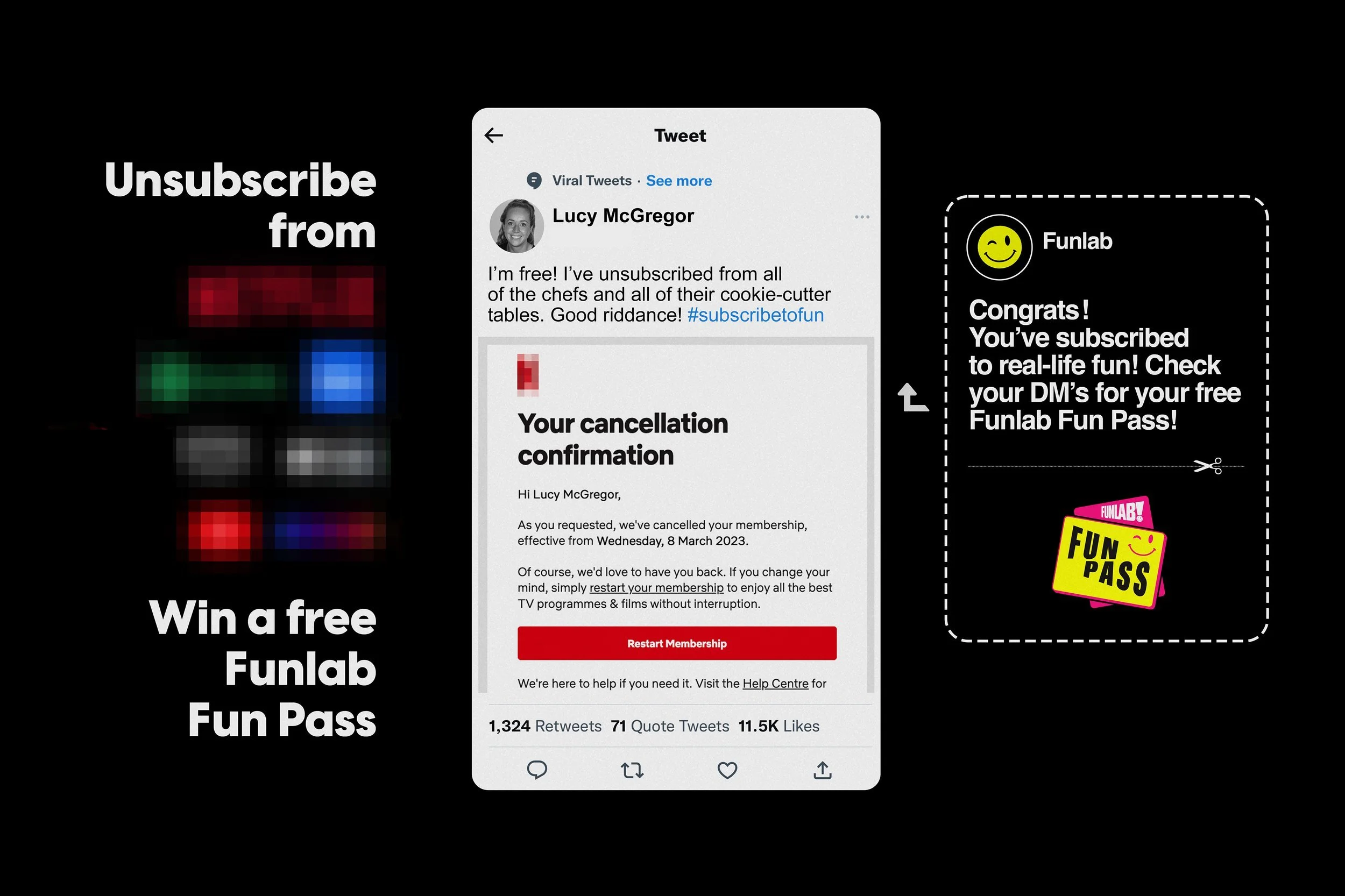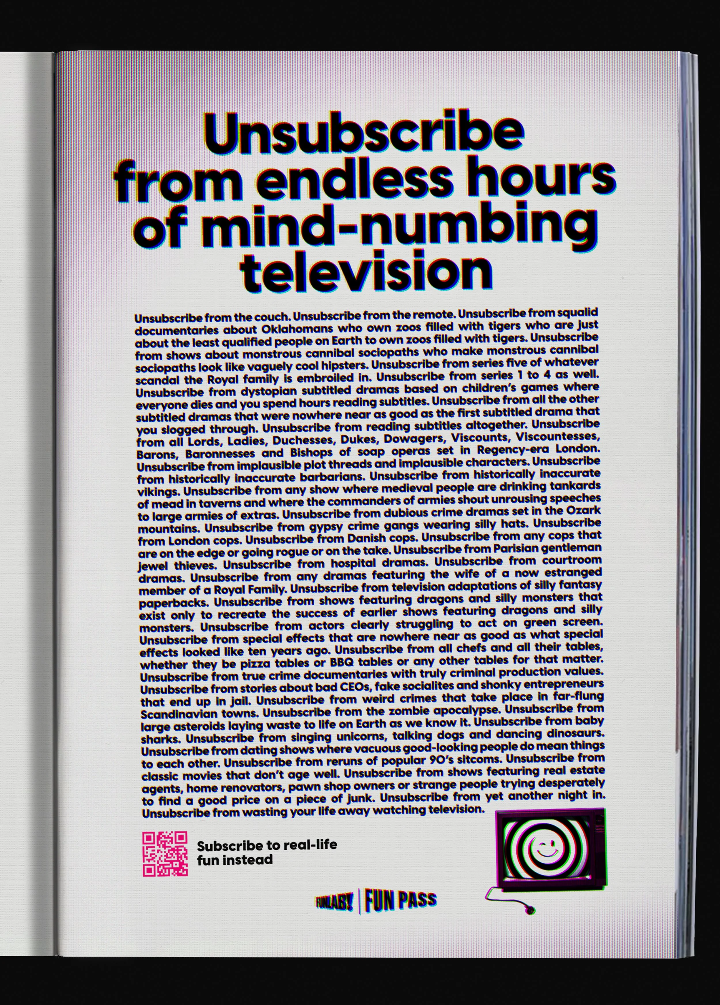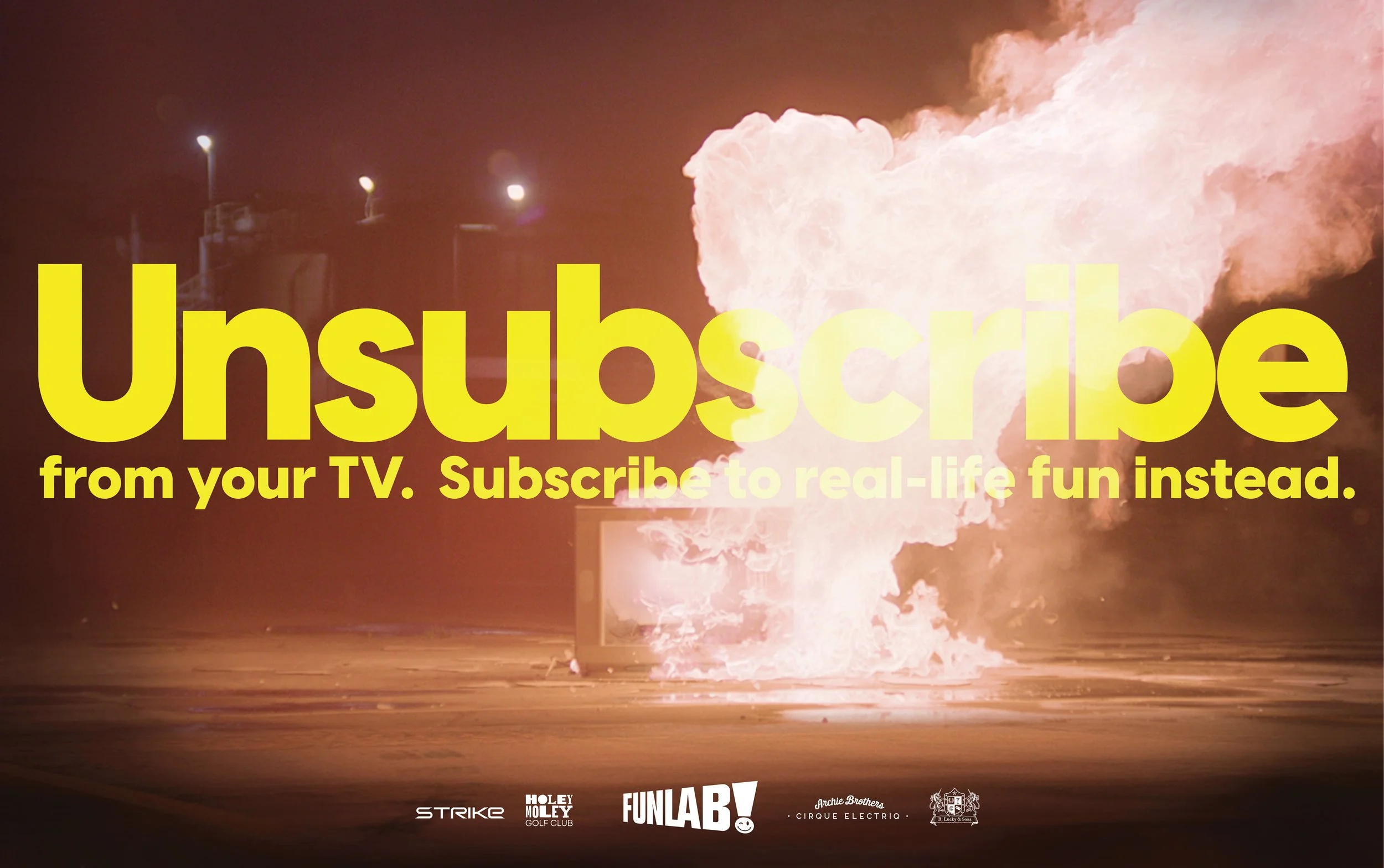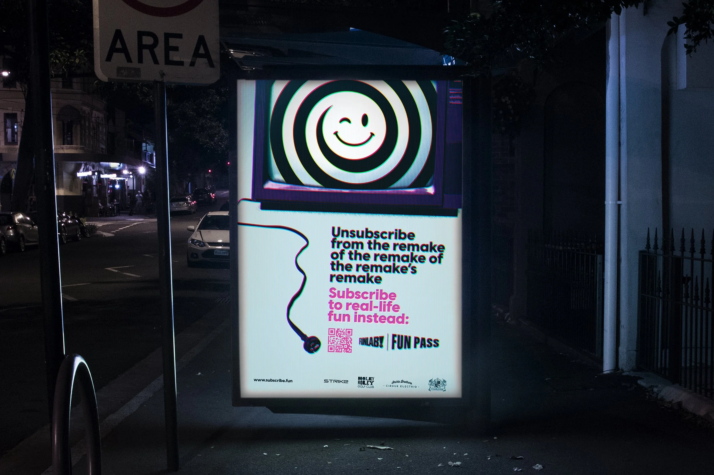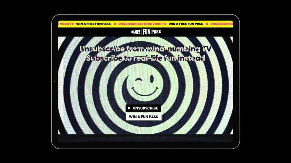 So we created Unsubscribe. A service that allowed Australians to unsubscribe from one of their TV streaming services and receive a subscription to Funlab’s Funpass. A subscription to real life fun for free. Real life experiences like bowling, arcade games, laser tag, escape rooms, mini golf, the list goes on.